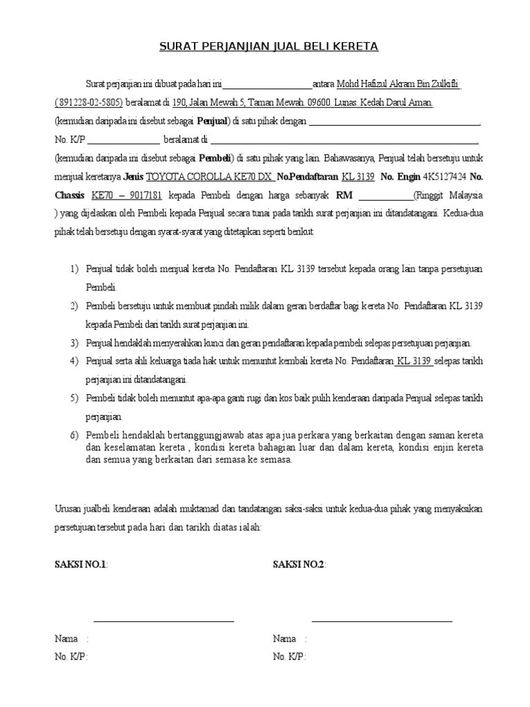 Masukkan terma2 yg dipersetujui bersama; Bahawasanya surat perjanjian ini diperbuat pada tahun:.bulan:. Kenderaan contoh surat perjanjian jual beli kereta contoh seputar surat. Bahawasanya surat perjanjian ini diperbuat pada tahun: Surat perjanjian jual beli kereta kaedah sambung bayar 1.